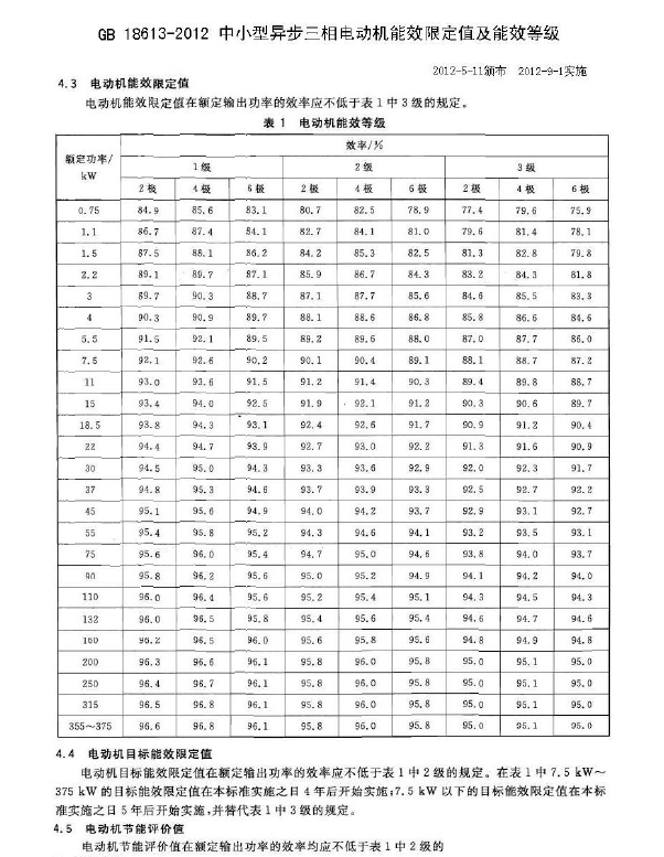 但是到了2012年,隨著我國發(fā)展與國際化的同步,我們國家又發(fā)不了GB_18613-2012_電動機(jī)能效限定值及能效等級判斷的標(biāo)準(zhǔn),如下表