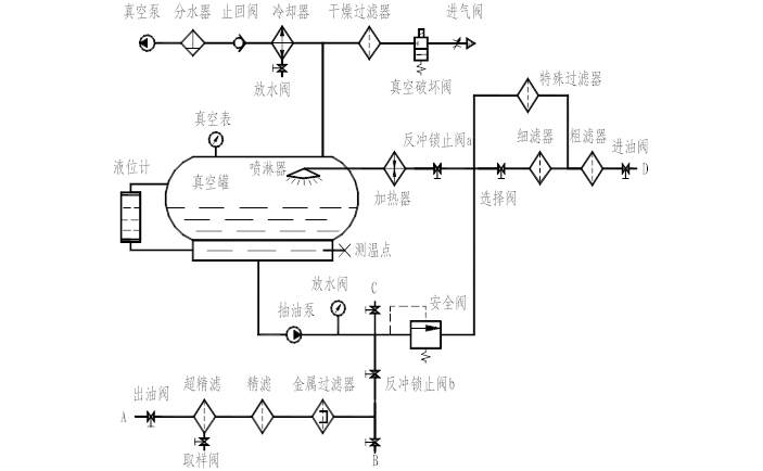 其功能為將真空罐內抽成真空負壓(一般為380~610毫米汞柱或更低),使油液中水分能在較低溫狀態下揮發;抽出的水蒸汽經冷卻器和分水器冷凝、析出;單向閥防止真空泵反轉。分水器和單向閥不能采用一般的氣動元件,必須采用適合在負壓下工作的氣動元件。冷卻器一般為塔式結構,容積較大,內裝親水性能好、耐高溫、耐腐蝕、全濕比表面積大的多面空心聚丙烯塑料球。從真空罐抽出的濕熱氣體沿塔壁切向斜下進入塔內,流速急劇減慢并形成向下的渦旋氣流,遇聚丙烯塑料球后流速進一步減慢,迅速冷凝成水滴。